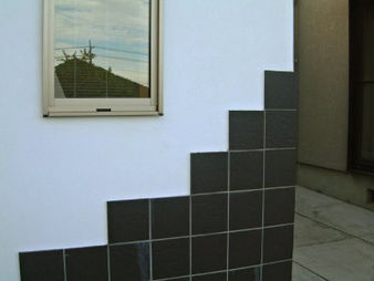 O邸は高台に建つ小さな仕事場。自然な内装を施したこの建物は、タイルの黒と漆喰の白が感じよく調和しています。
